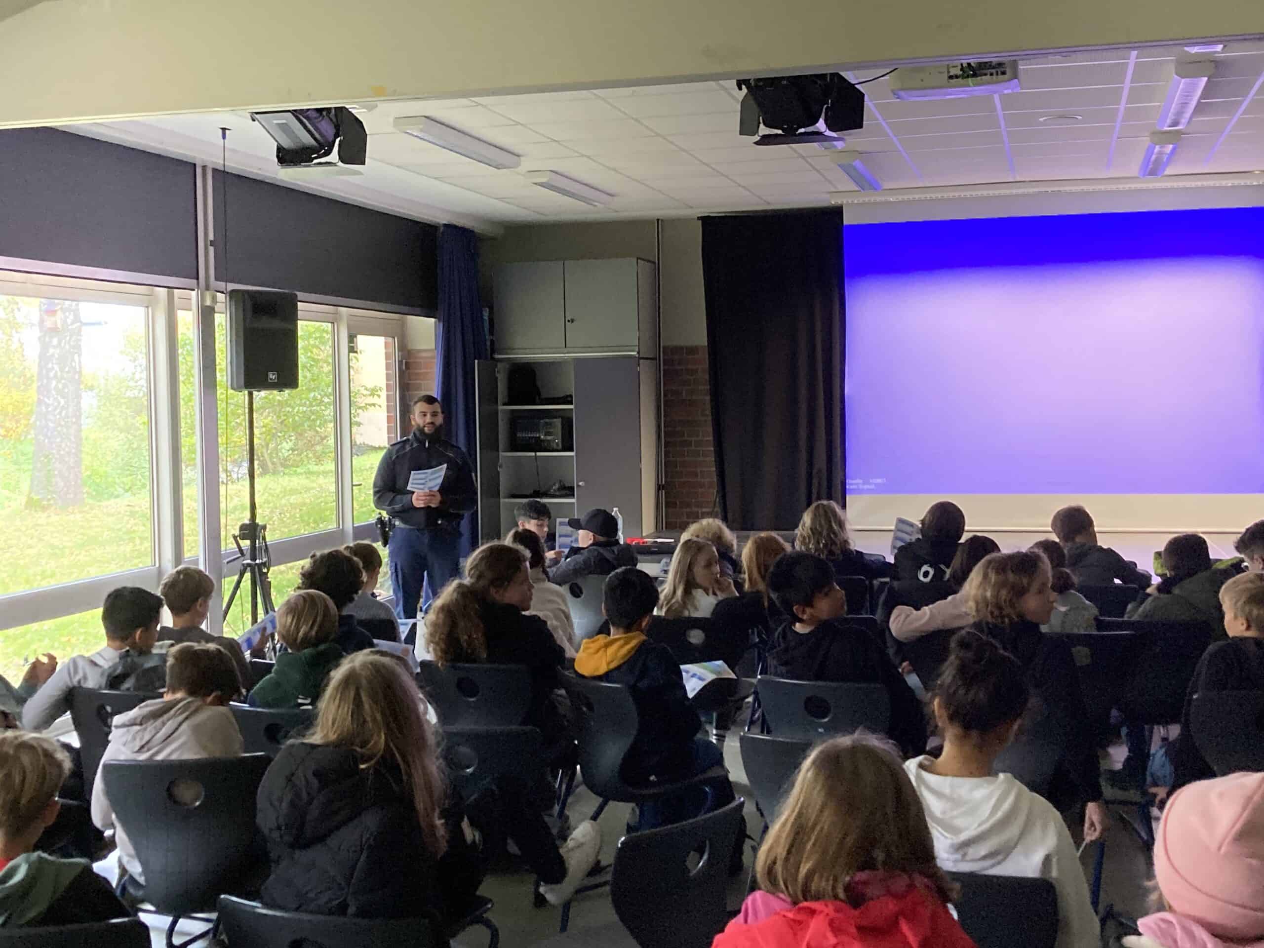 Zurück in der Schule erklärte Salim Ankur von der Bundespolizei eindrucksvoll, welche Kräfte bei einem Zug wirken und warum es einen erheblichen Unterschied macht, ob ein Auto oder ein tonnenschwerer Personenzug bremsen muss: Ein Zug, der mit 160 km/h fährt, benötigt etwa 1.000 Meter, also rund einen Kilometer, um zum Stillstand zu kommen — viel zu lange, um rechtzeitig vor einer Person oder einem Hindernis auf den Gleisen anzuhalten.Zudem wurde die Gefahr durch die 15.000 Volt führende Oberleitung behandelt. Diese muss nicht einmal berührt werden – bereits die Annäherung kann zu einem tödlichen Stromüberschlag führen. Anhand des Films „Olis letzte Chance“ regte Salin Ankur von der Bundespolizei ein Gespräch über die möglichen Gefahren im Bahnverkehr und an Bahnanlagen an. Ein spannendes Quiz rundete den Vortrag ab, bevor er sich den vielen neugierigen Fragen der Kinder zur Polizeiarbeit und Verkehrssicherheit stellte.