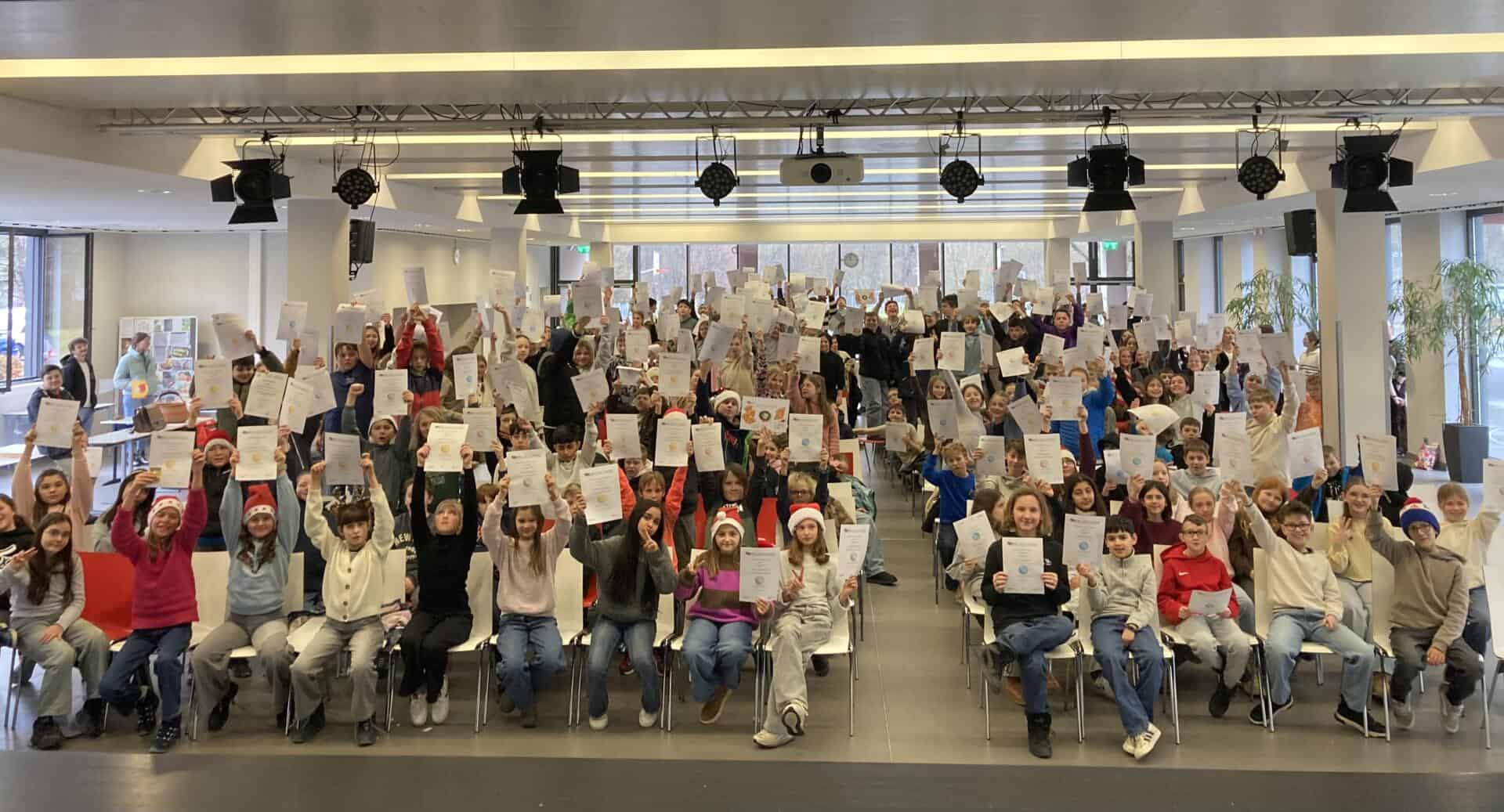 Mitgemacht haben dabei in diesem Jahr grandiose 231 Schülerinnen und Schüler. Sie haben 4012 Antworten abgegeben, davon 3490 richtige! Dementsprechend war bei der Siegerehrung große Aufregung und richtig volles Haus in der Mensa der MLS.